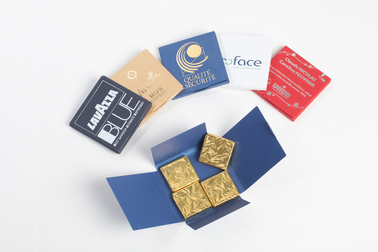 Pochettes carrées garnie de napolitains. Grande surface d’impression : recto, verso et rabats intérieurs. 4 napolitains carrés.